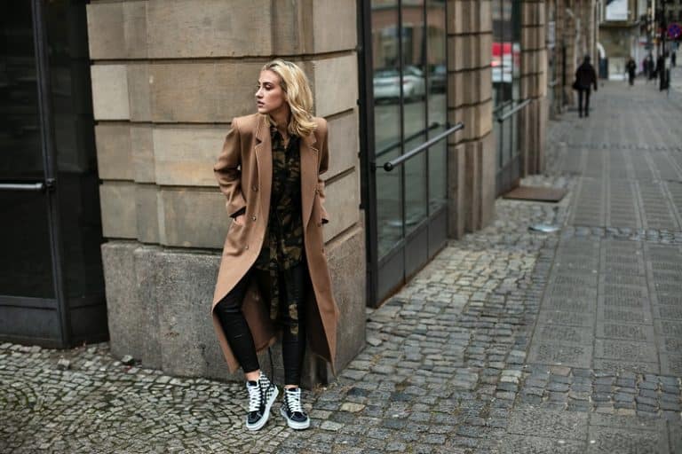 - L’allure urbaine prend une nouvelle ampleur quand on associe des baskets hautes noires avec un pantalon en cuir moulant, une chemise à motif camouflage, et un manteau camel structuré. Résultat : une silhouette marquée mais sans excès.